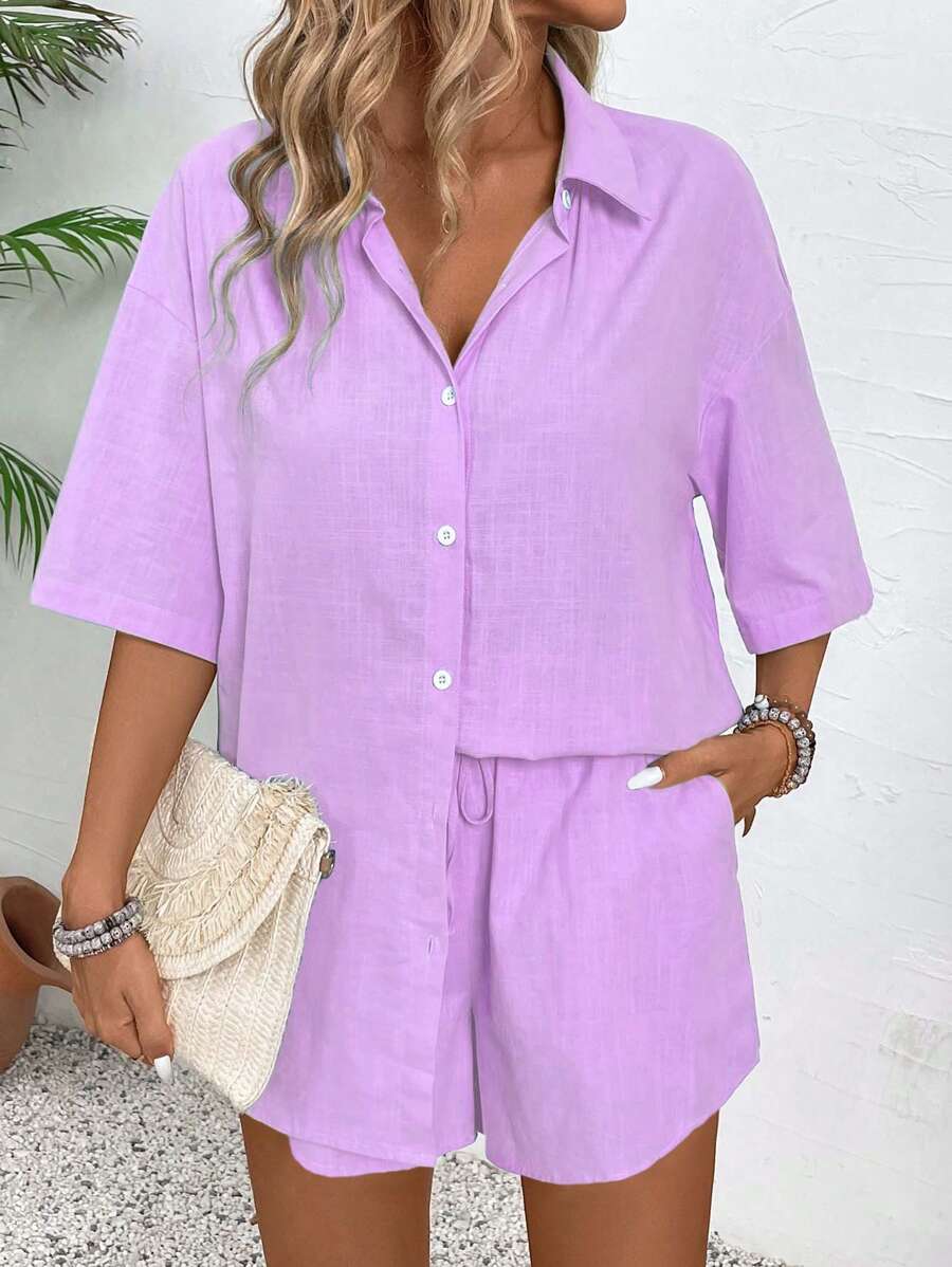 Bold Rush 2pcs Women's Summer Loose Solid Color Drop-Shoulder Blouse And Drawstring Waist Shorts Set