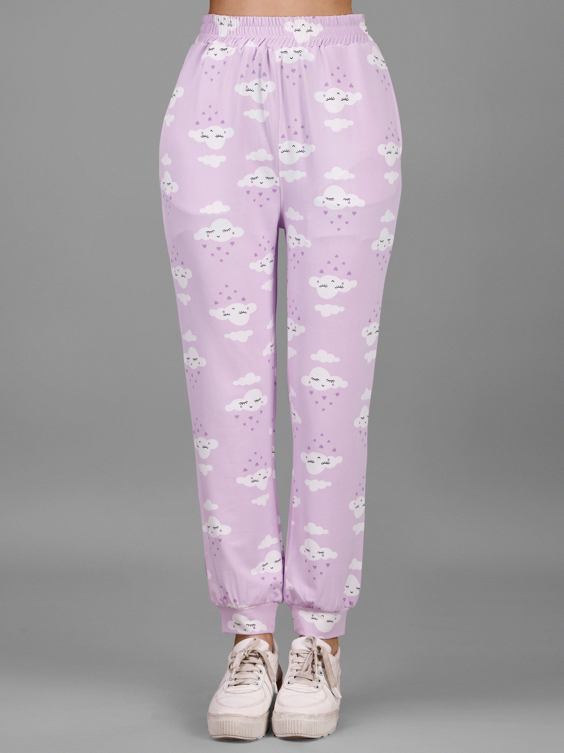 - Design & Style: This stylish co-ord set features a charming cloud print in soft pastel purple, bringing a light and dreamy vibe to your wardrobe. The set includes a short-sleeve top with a relaxed fit and matching jogger pants with an elastic waistband and cuffs, making it ideal for both lounging and casual outings.