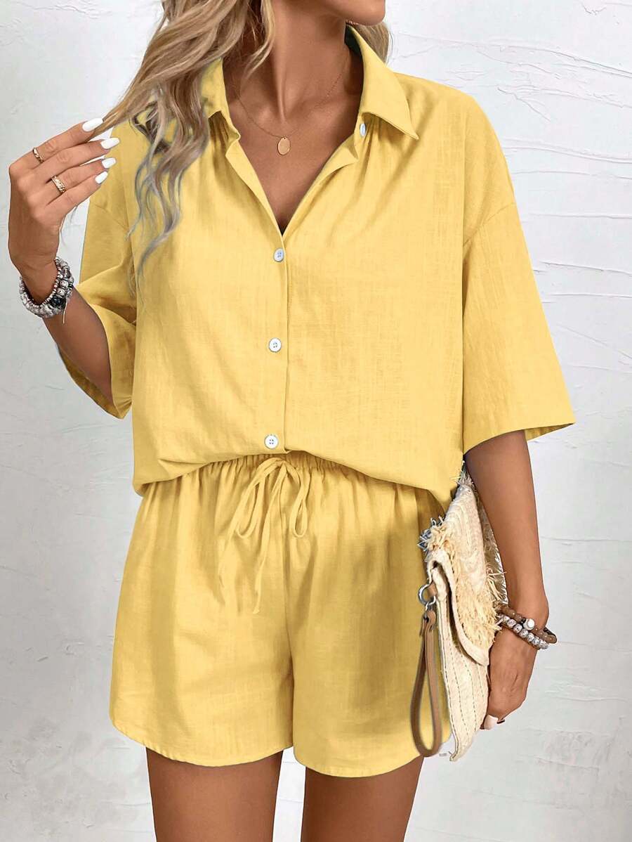 Bold Rush Women's Vacation Casual Solid Color Short Sleeve Shirt And Shorts Set