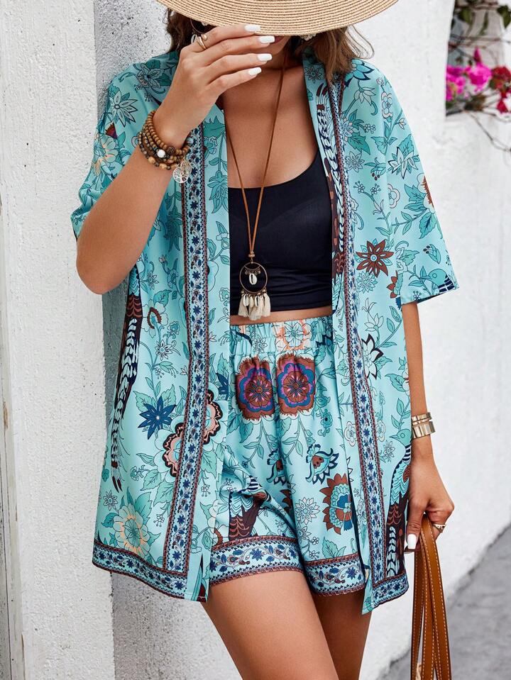 Bold Rush Women's Vacation Floral Print Open Front Kimono And Shorts Set, Random Print